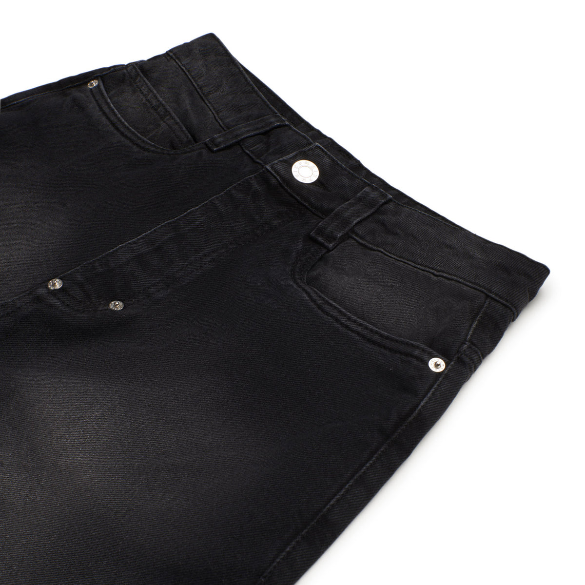 Finishing: Washed denim with metal SIX PM buttons at fly, SIX PM rivets and faux leather badge at waistband