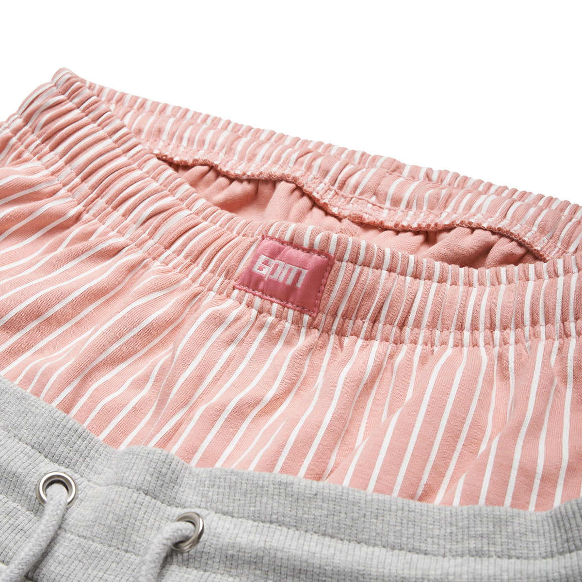 Finishing: Shorts with sewn on printed striped boxer shorts, logo embroidery under pocket, woven label center front of boxer