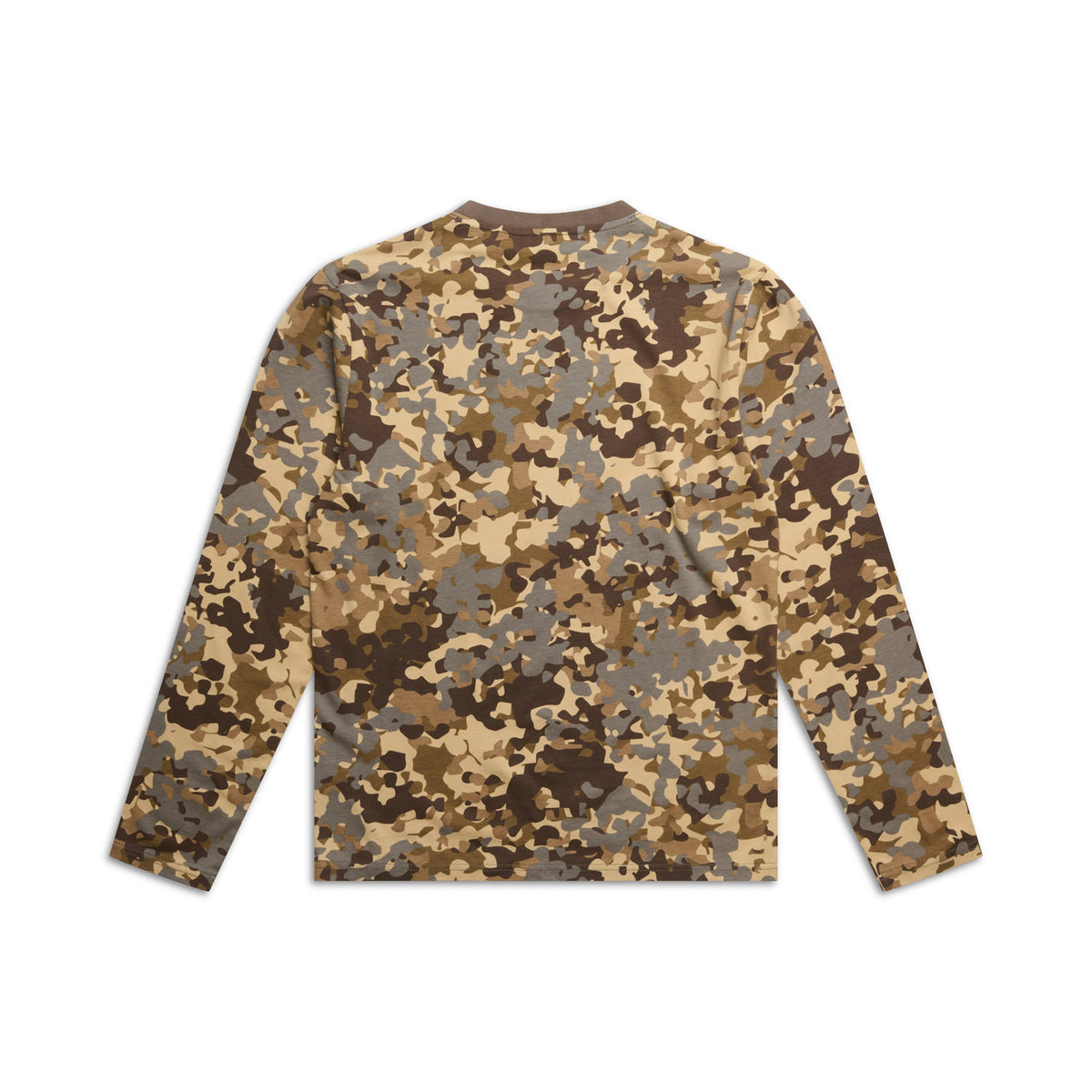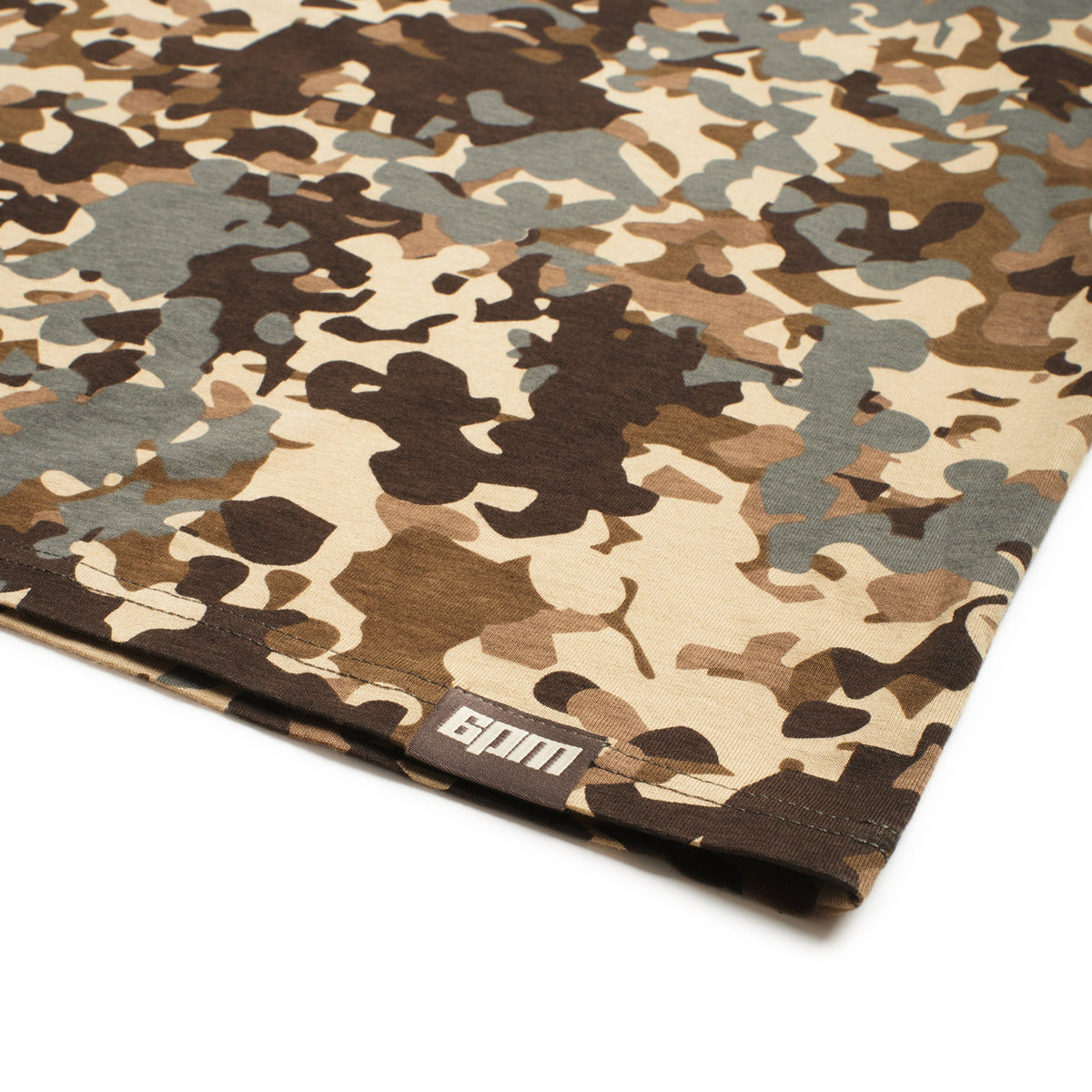 Finishing: All over printed camo, 6pm Logo fold label at hem
