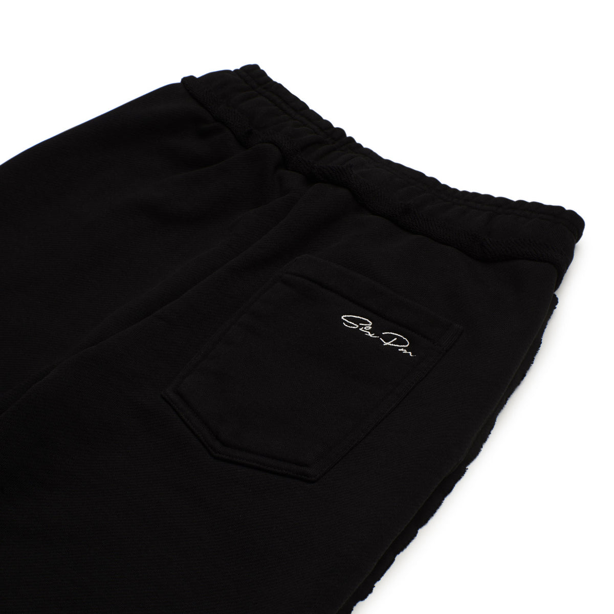 Finishing: Heavy unbrushed felpa fabric, adjustable waistband with cords, open edge details, handwritten SIX PM logo