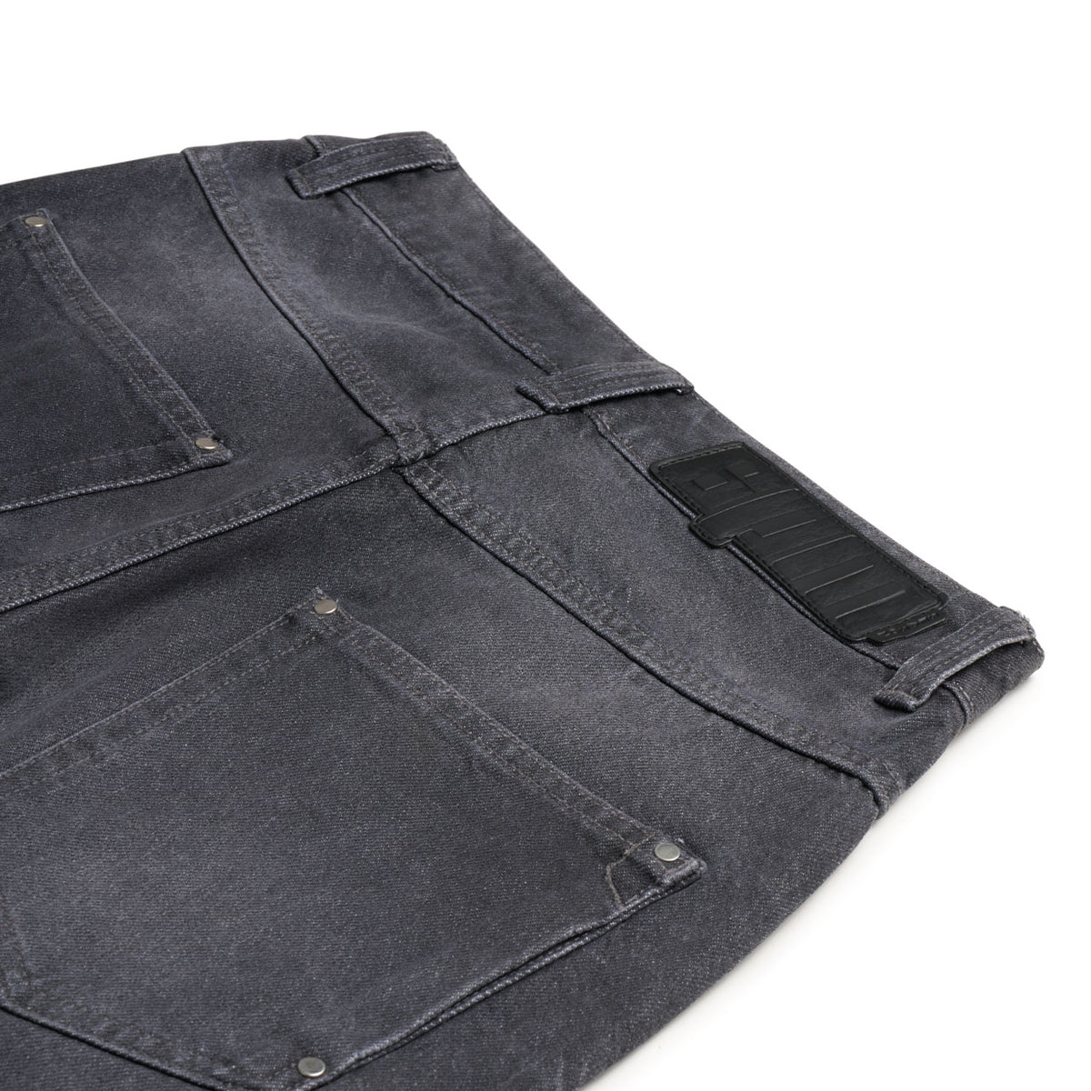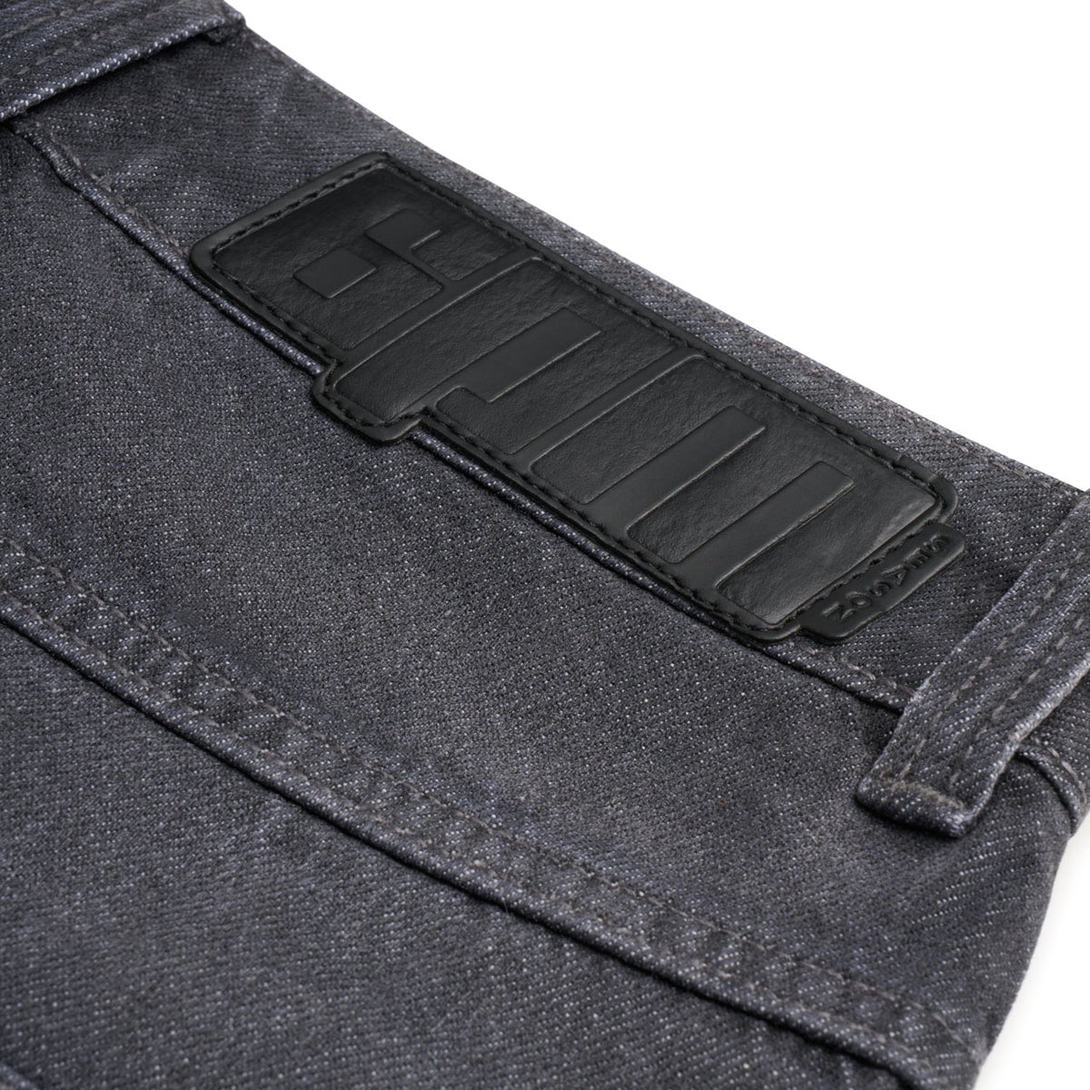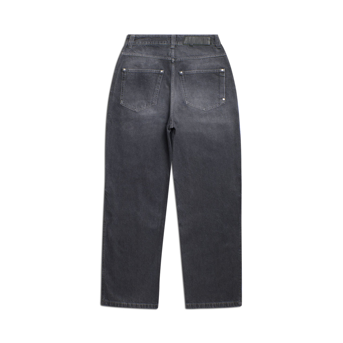 Finishing: Heavy coated denim with wash effect, silver metal trims and faux leather badge, wide fit