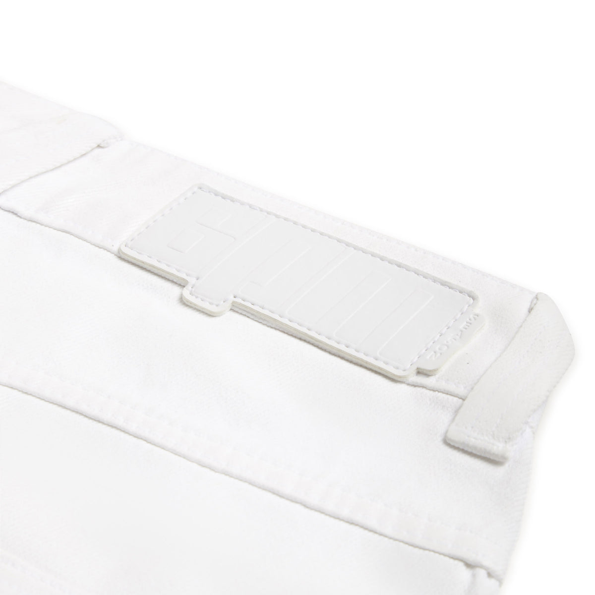 Finishing: Heavy coated denim with metal trims and faux leather badge, wide fit