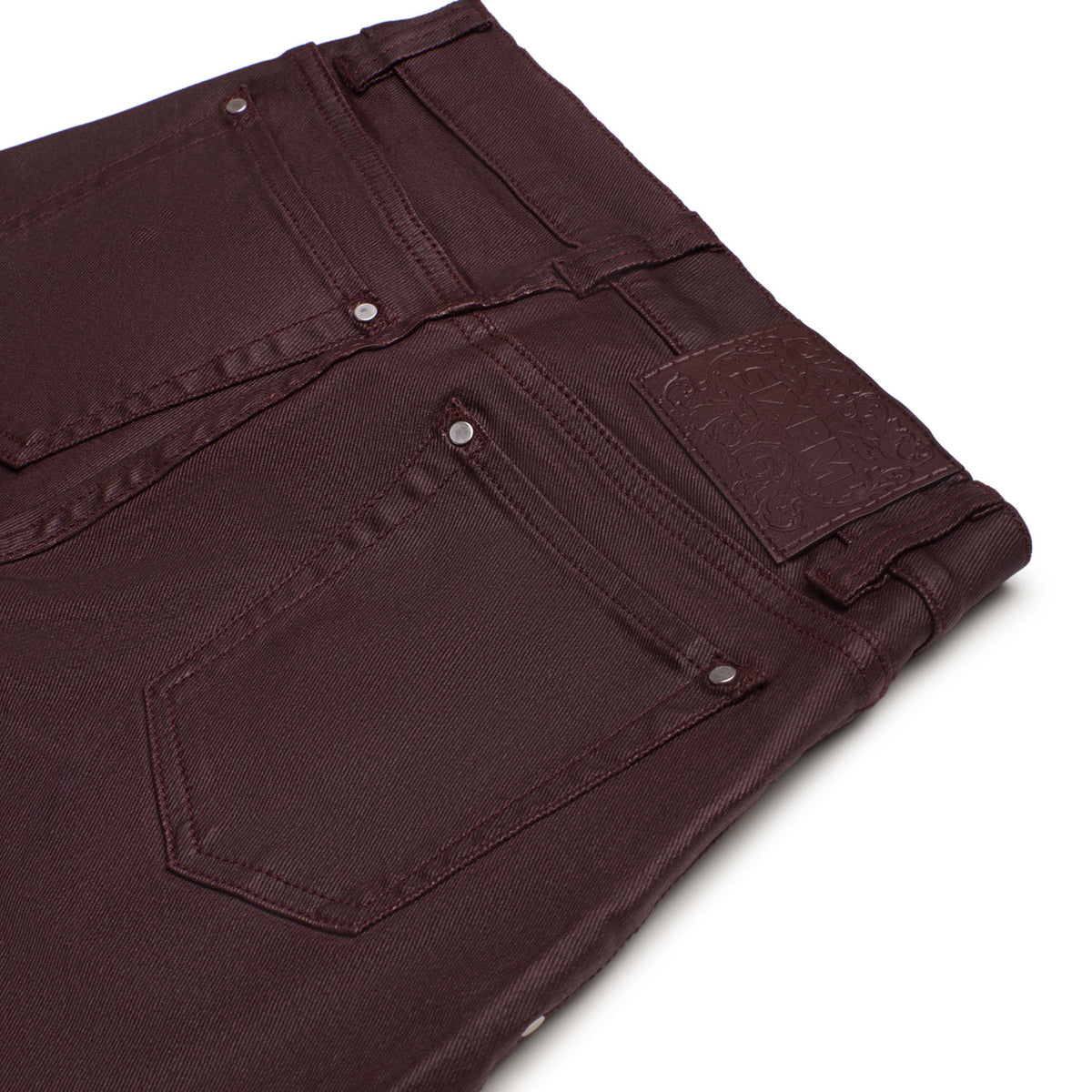 Finishing: Stretchy denim with tonal triple needle topstitching, ornament 6 buttons at fly and ornament faux leather badge at waistband, denim stud details