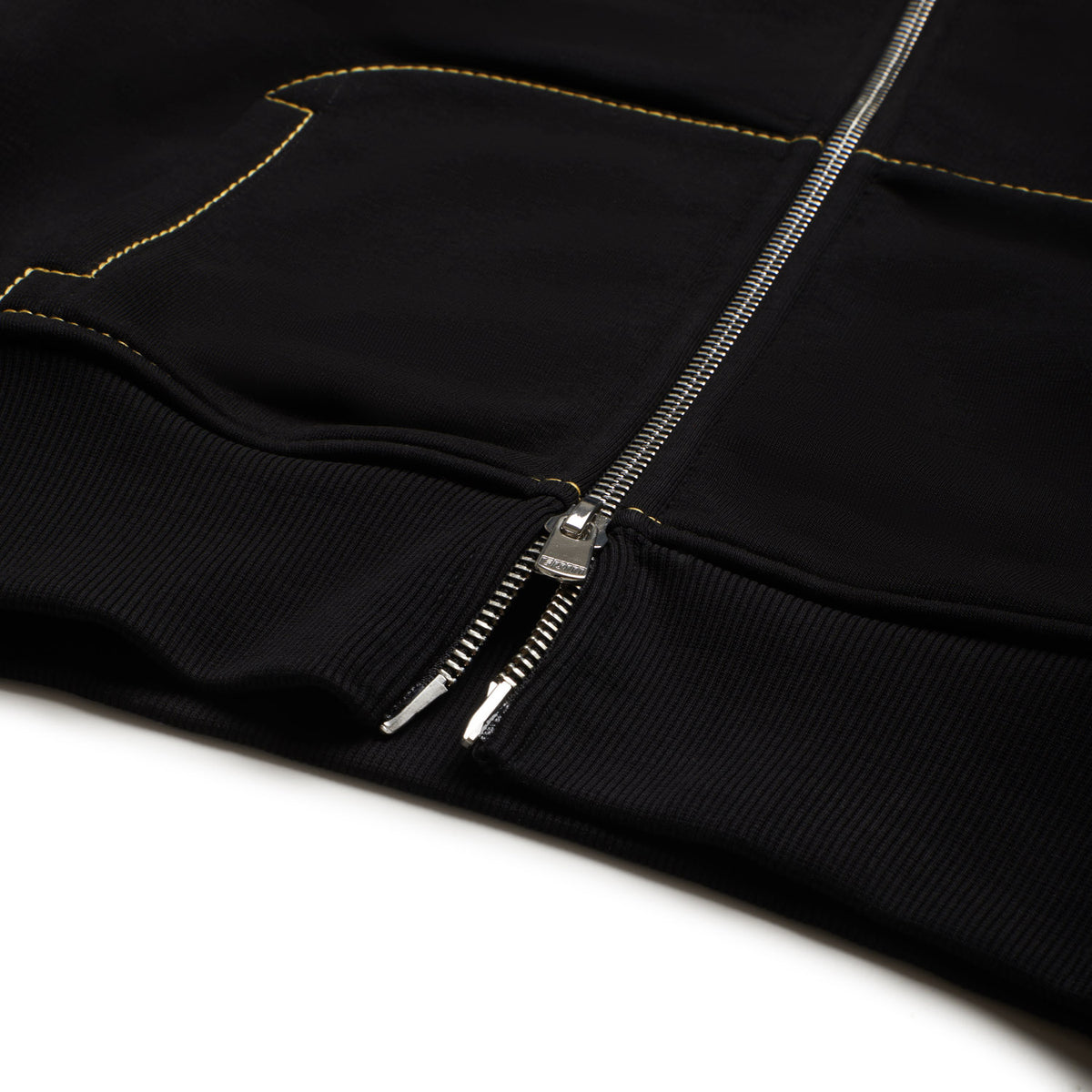 Finishing: Brushed cotton fleece fabric with rib at cuffs and hem, 2-way metal zipper, coloured topstitching and zic zac embroidered stitching