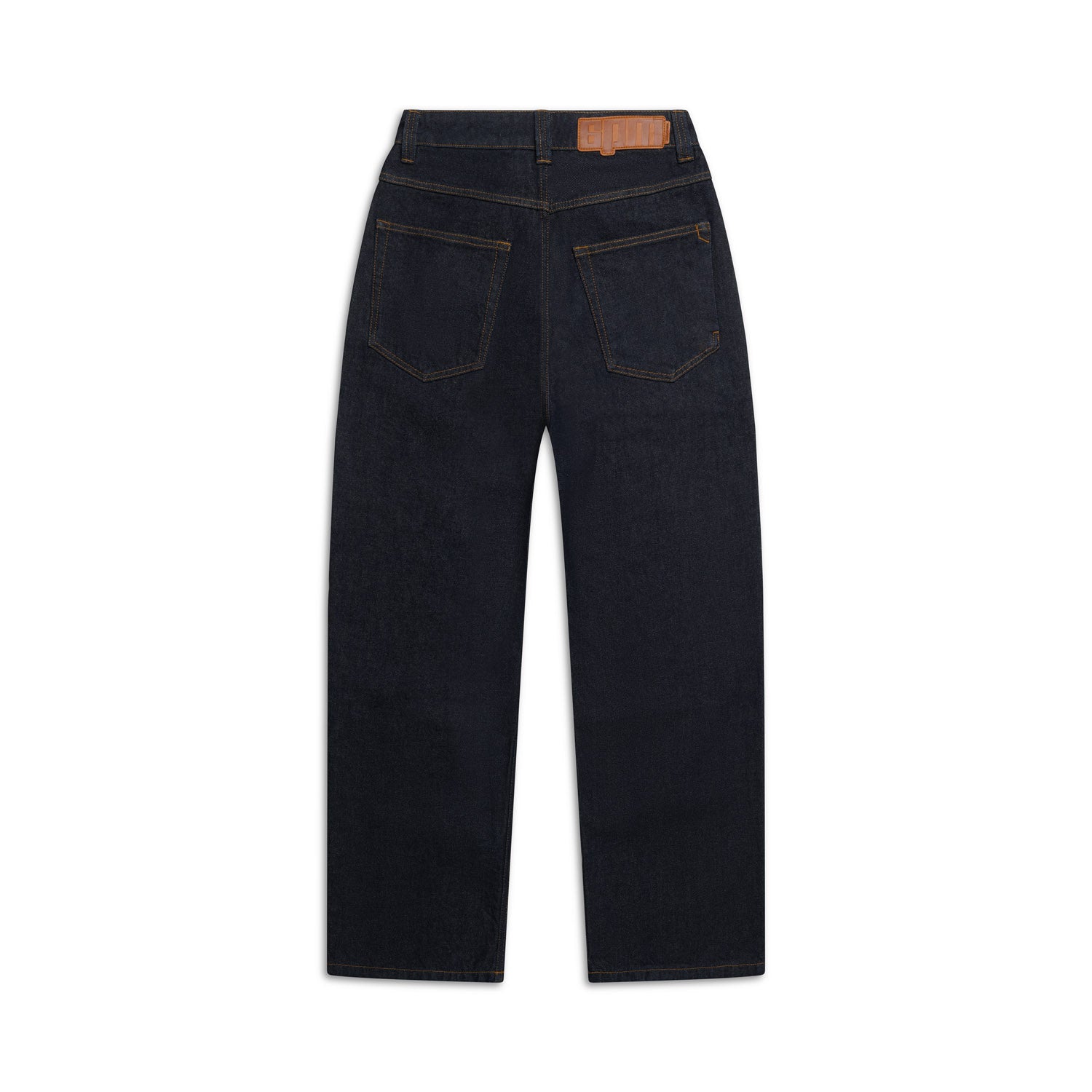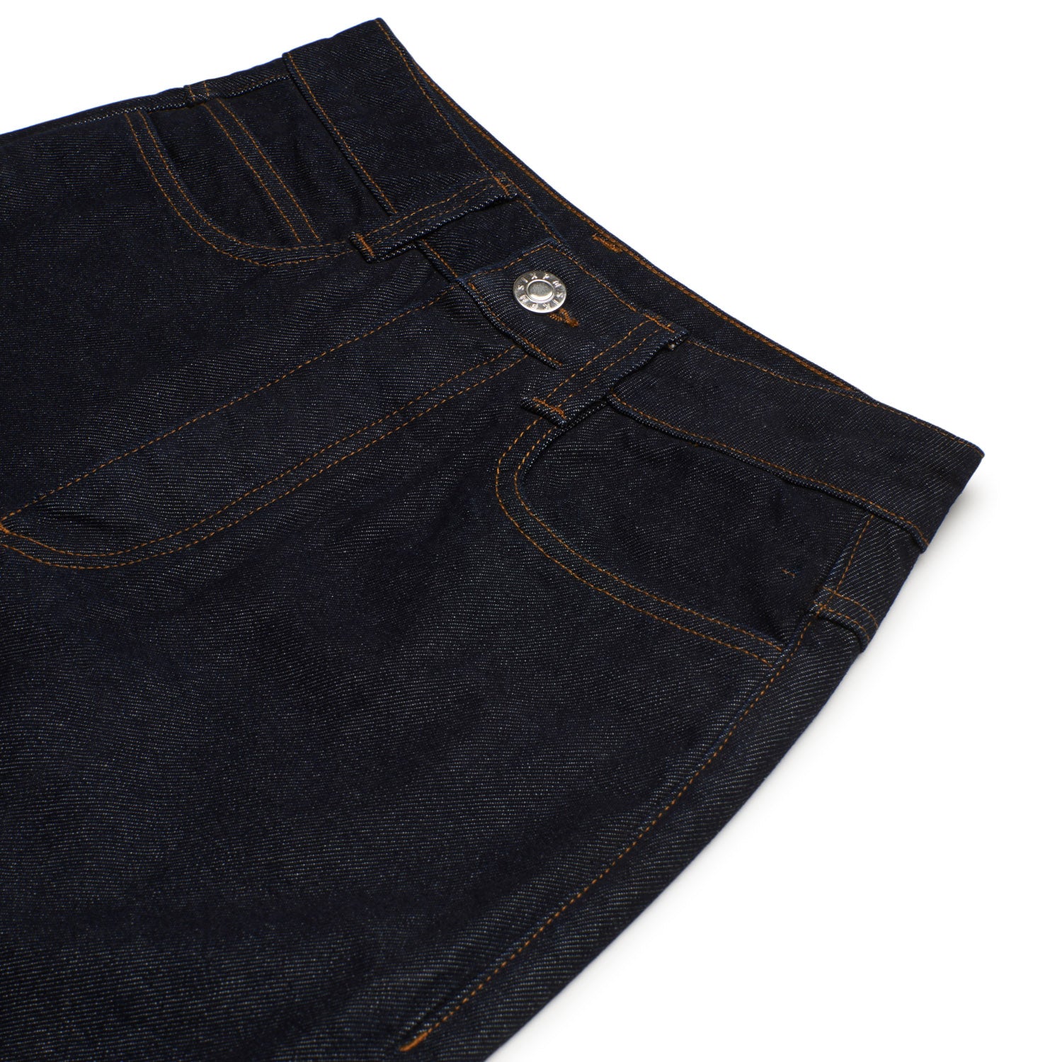 Finishing: Raw denim rinse washed with coloured topstitching, SIX PM metal buttons at fly, faux leather badge