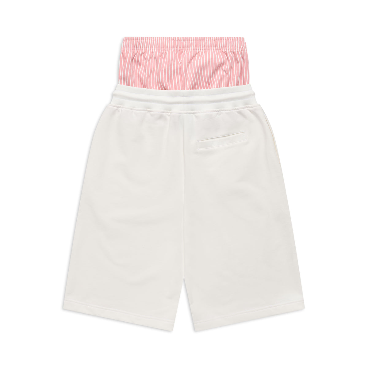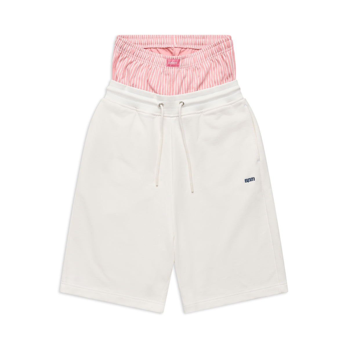 Finishing: Shorts with sewn on printed striped boxer shorts, logo embroidery under pocket, woven label center front of boxer