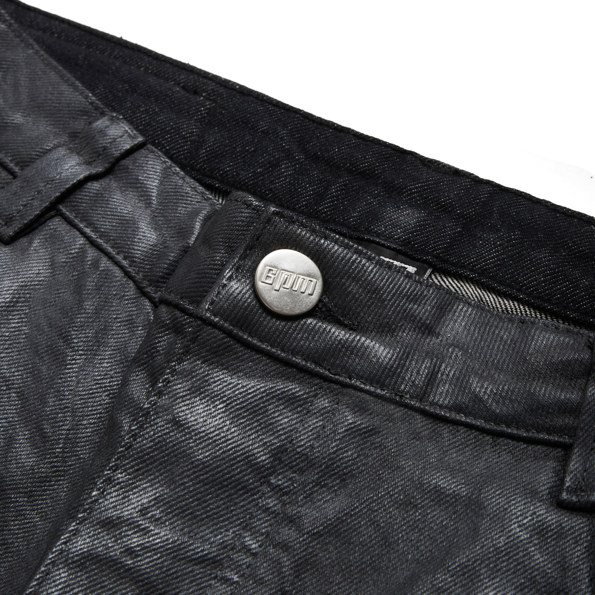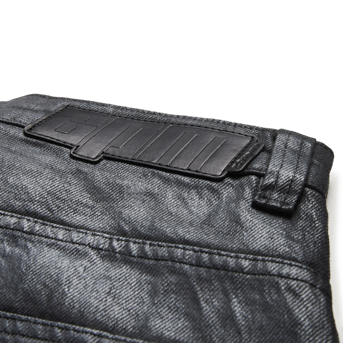 Finishing: grey Coating, long fit, metal logo buttons, faux leather badge