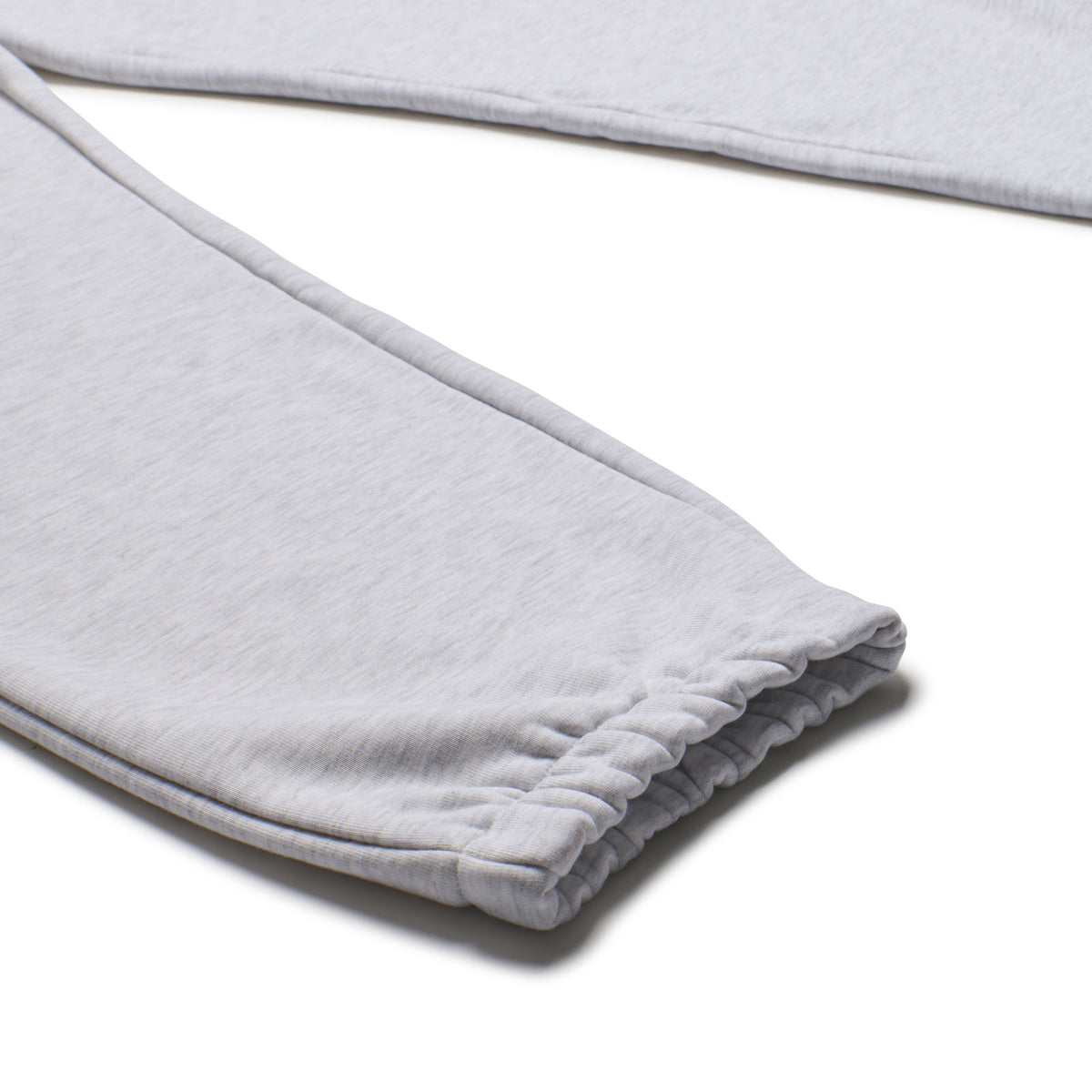 The 6PM CUFF JOGGER LIGHT GREY features an elastic waistband with drawstring, two side pockets, and cuffed ankle openings, shown laid flat on a white background. A person faces forward wearing a fitted white tank top, 6PM CUFF JOGGER LIGHT GREY sweatpants with cuffed legs, and white sneakers. The background is transparent.