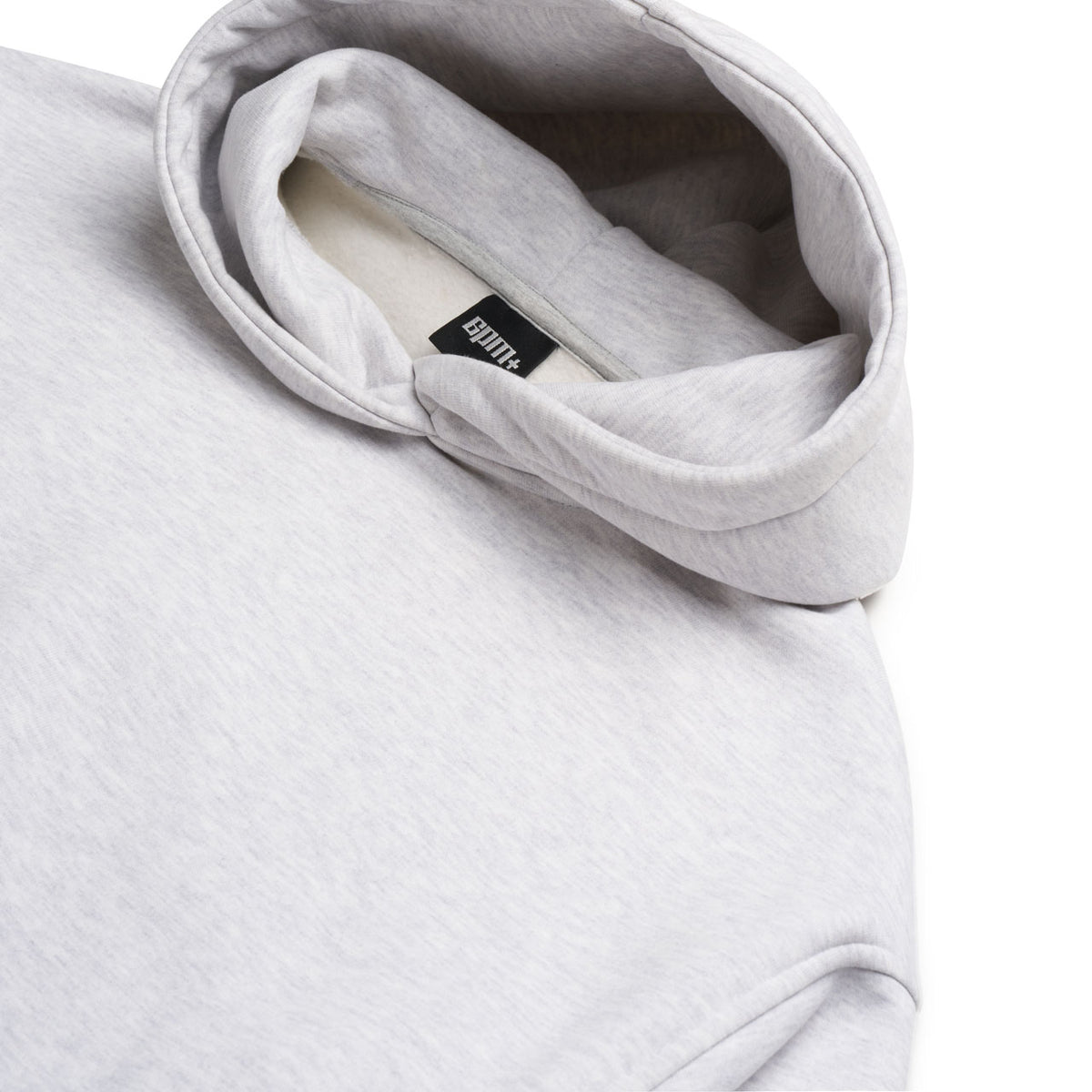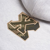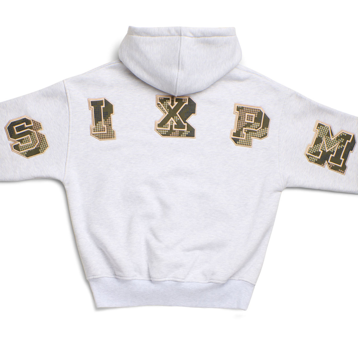 Finishing: Hoodie with embroidered logo badges across the back. Printed camo pattern.