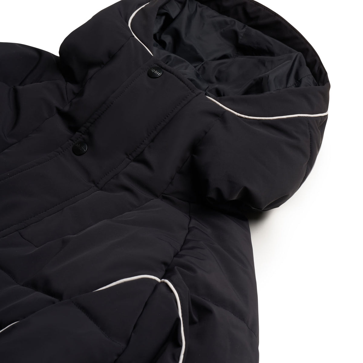 Finishing: Padded pullover half-zip jacket with buttoned cover and side seam zip for easy access. Kangaroo pocket at the front with hidden compartment. Adjustable hood, cuffs and hem, embroidery logos.