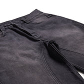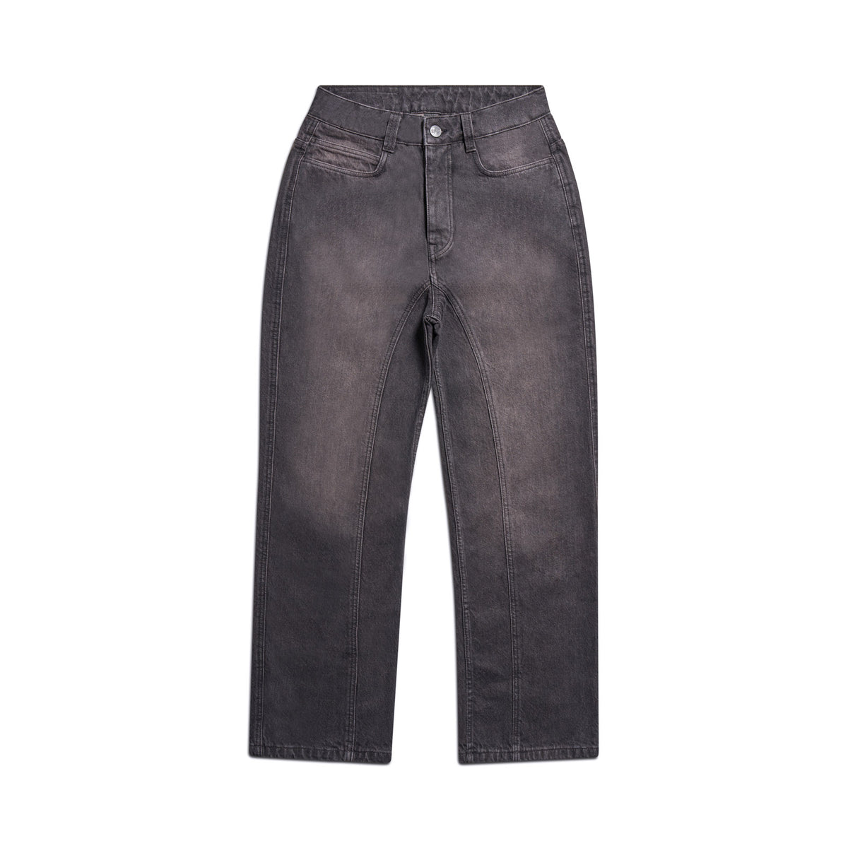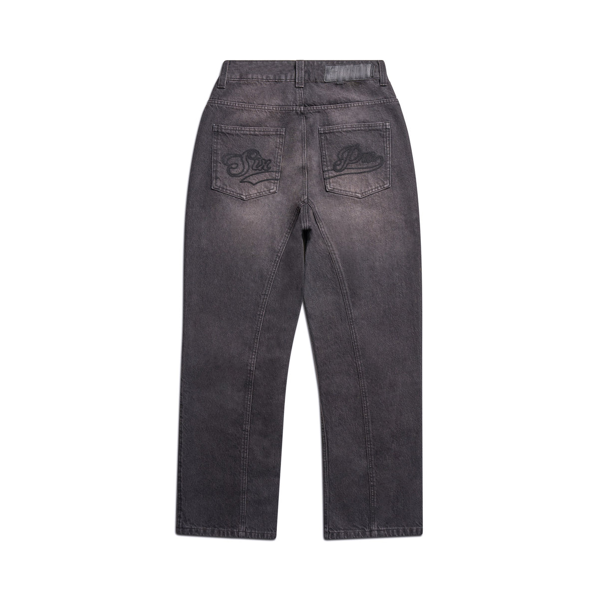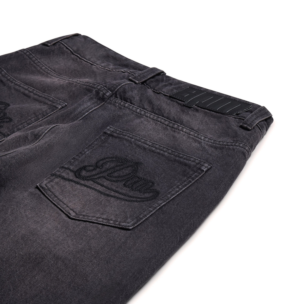 Finishing: 13.5 oz denim with wash and overdye, Chainstitch script logo embroidery on back pockets