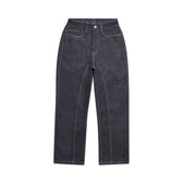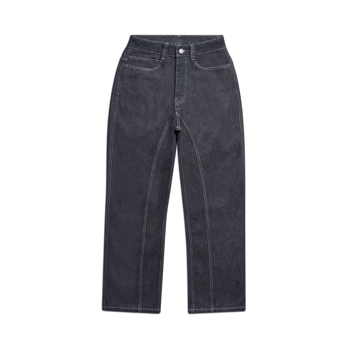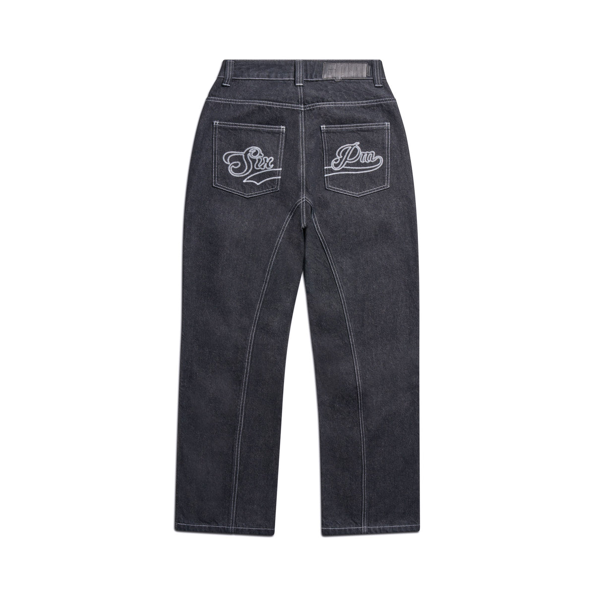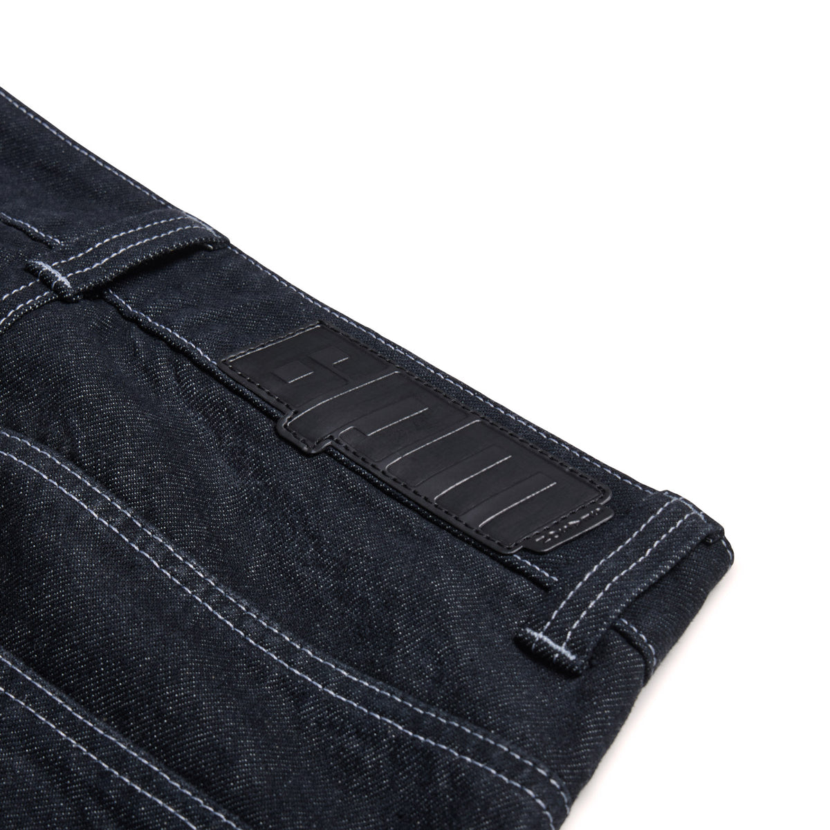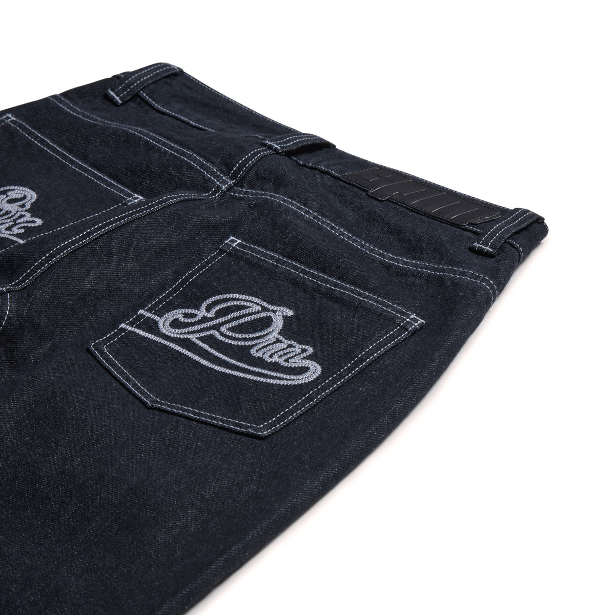 Finishing: 13.5 oz raw denim with white contrast stitching and script logo embroidery on back pockets