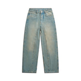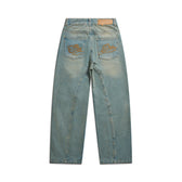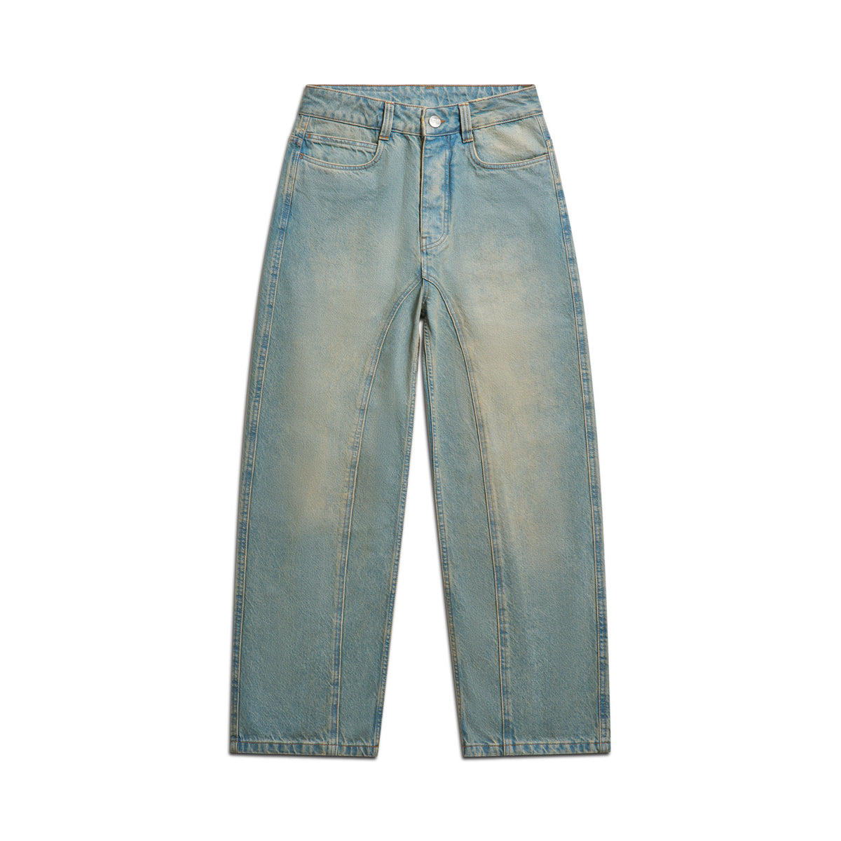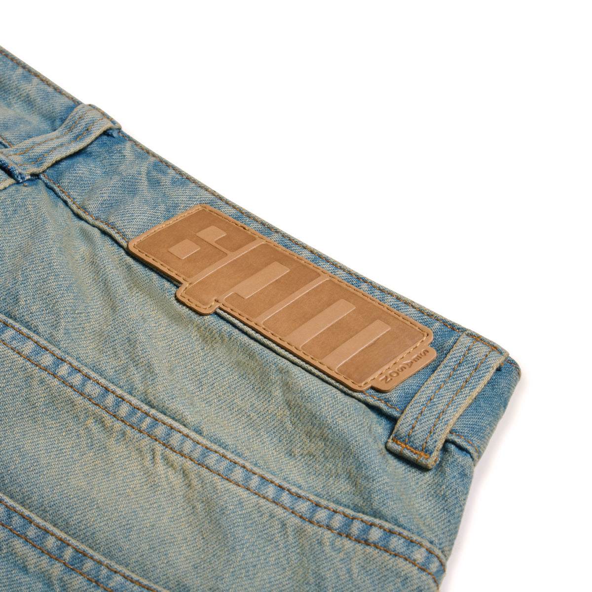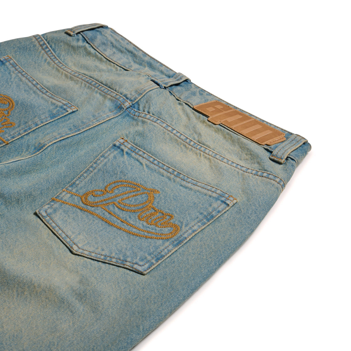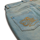 Finishing: 13.5 oz denim with wash and overdye, Chainstitch script logo embroidery on back pockets