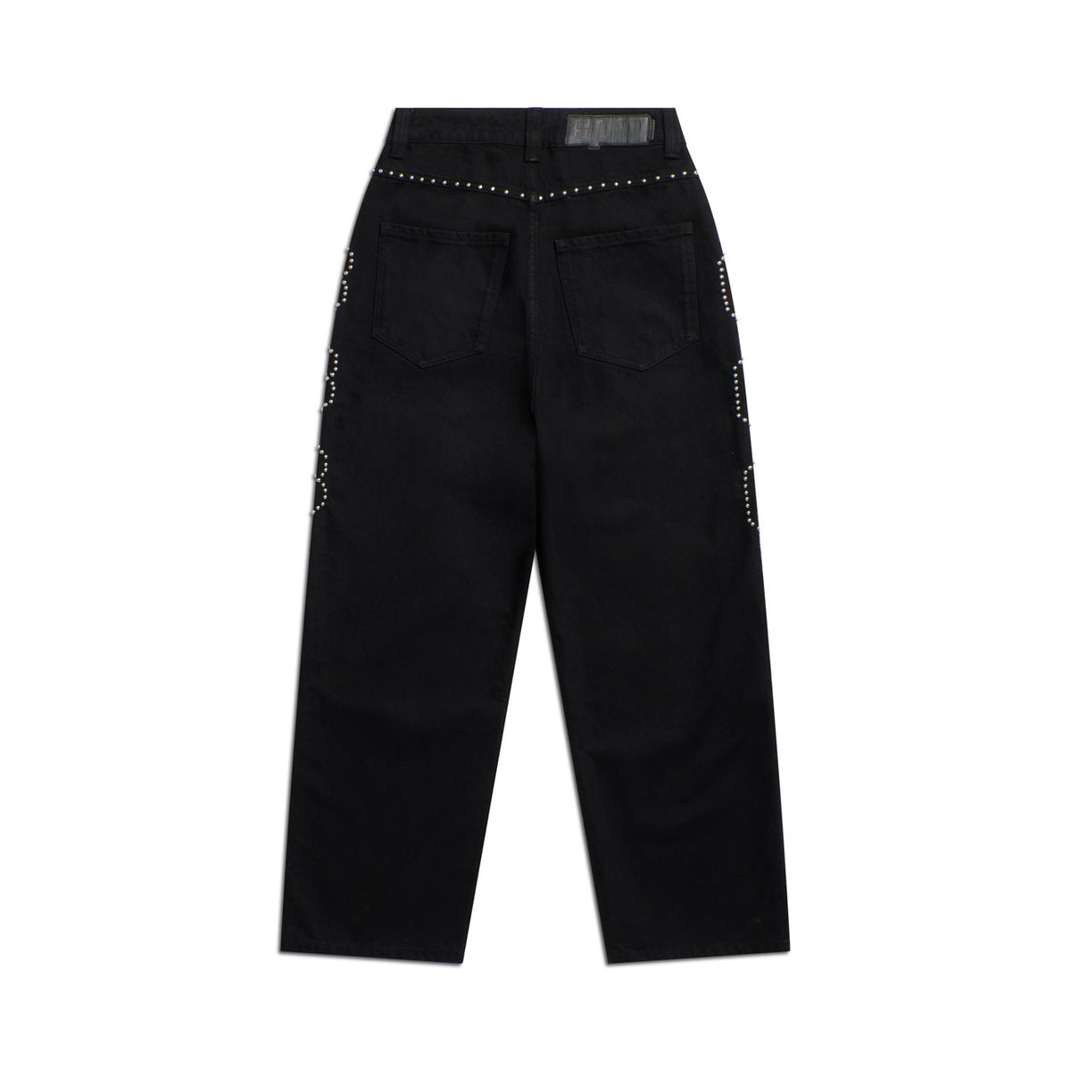 Finishing: Wide denim pants with studded graphic on sides, faux leather badge and metal trims