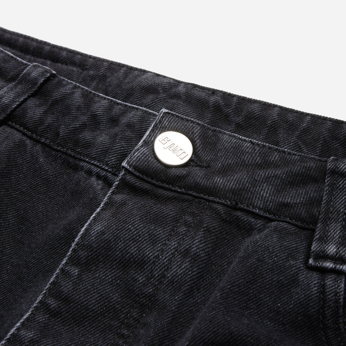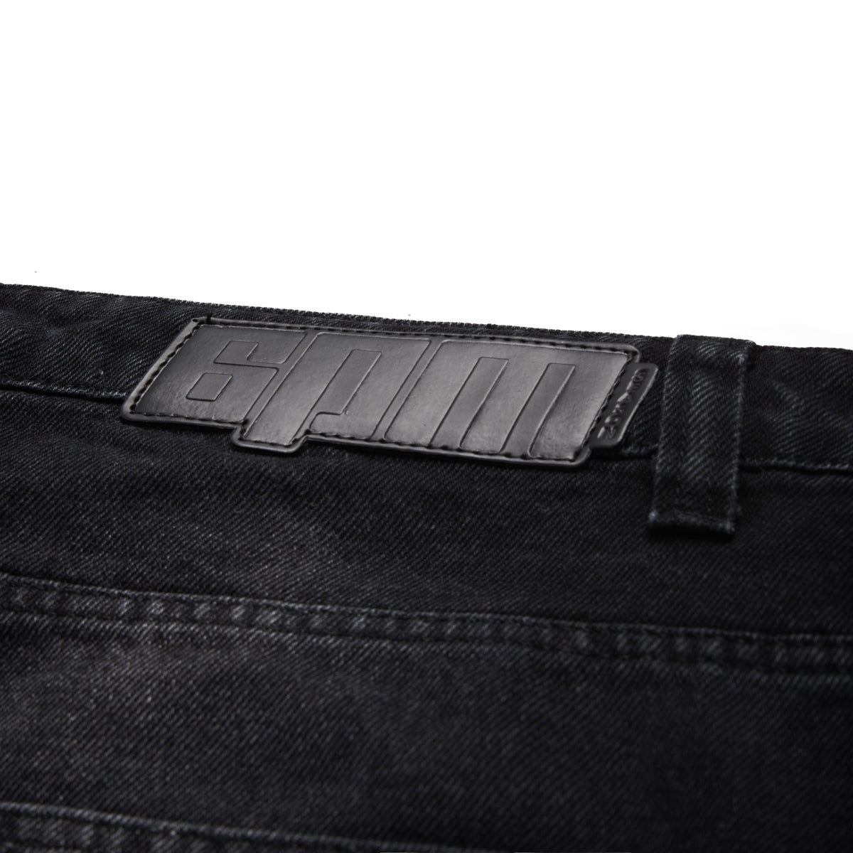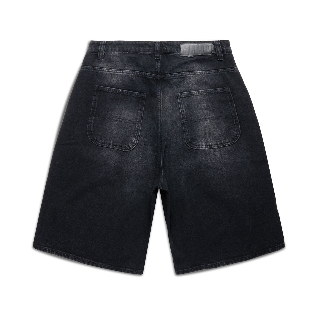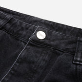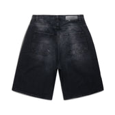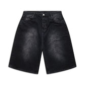 A man stands facing forward wearing a white tank top, 6PM WASHED DENIM SHORTS BLACK, white athletic shoes, and white socks with blue and red stripes. The background is transparent.