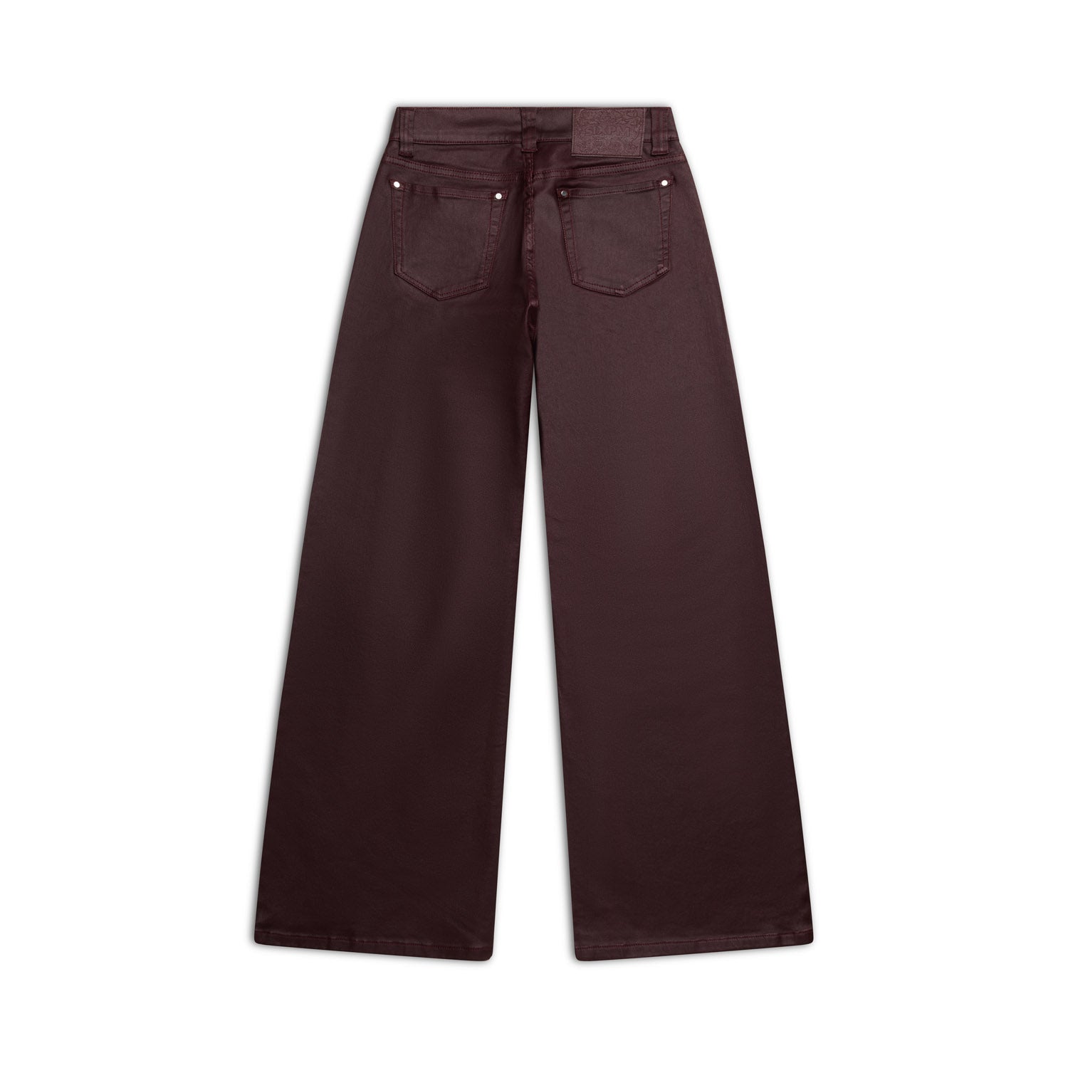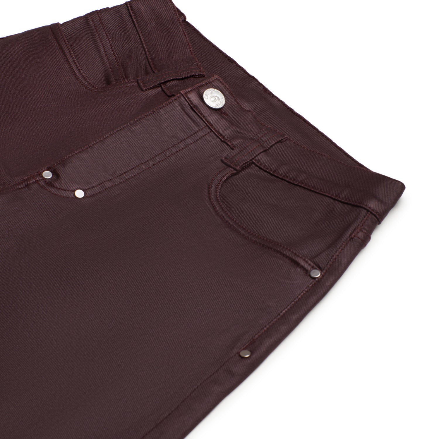Finishing: Stretchy denim with tonal triple needle topstitching, ornament 6 buttons at fly and ornament faux leather badge at waistband, denim stud details